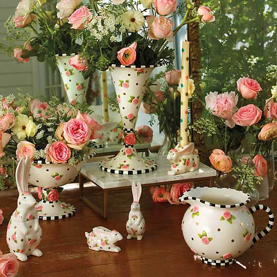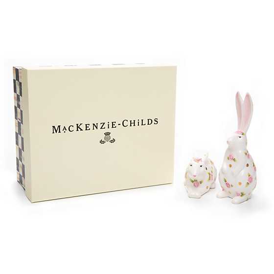 Spice things up with the Patience Brewster Really Rosy Salt & Pepper Set. This set of two hand-painted ceramic shakers are bunnies decorated in hand-painted dimensional pink roses and dots of gold lustre.