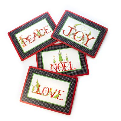 The set of four Patience Brewster Season’s Greetings! Cork Back Placemats have a heat-resistant lacquered surface that features an art print of whimsical elves expressing seasonal sentiments on a hardboard substrate that is backed with natural cork.