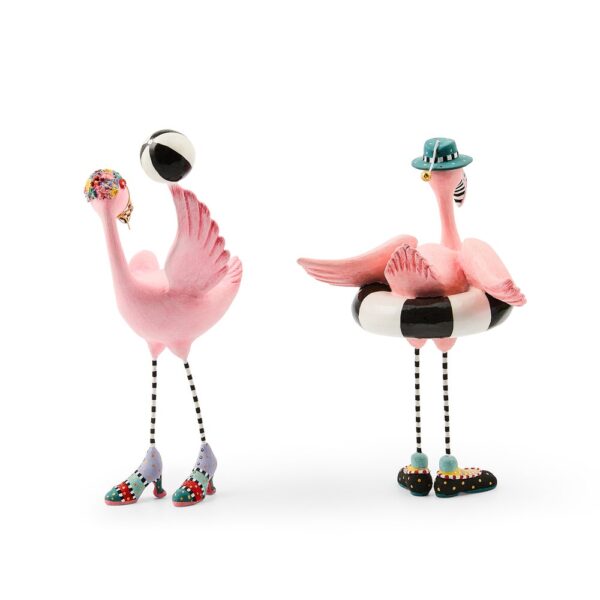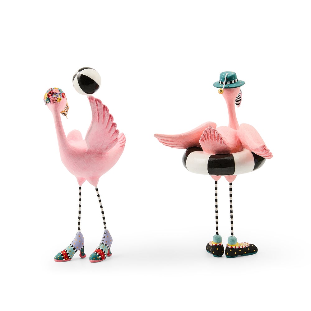 Throw a spring fling with these Patience Brewster Shelia and Sheldon Flamingo Figurines. These playful characters are pool party-ready and decorated with black and white accents.