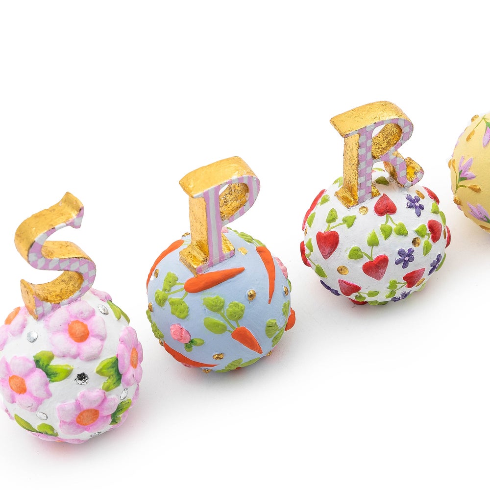 Spring ahead with the Patience Brewster Spring Letter Set, featuring decorated eggs that spell out S-P-R-I-N-G in pink checks and stripes to welcome the new season.