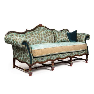 Our one-of-a-kind, generously sized Peacock Sofa adds more than a bit of panache to any interior. Its domestic mahogany frame, embellished with hand-painting from our Aurora artisans, is dressed in a woven peacock feather print and topped with a loose cushion that reverses from aqua to teal, trimmed with striped velvet boxing and stitched harlequin cording. The back is a star as well, covered with teal velvet and finished with antique brass nailheads. Includes two throw pillows that reverse from peacock feather print to teal.
