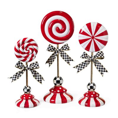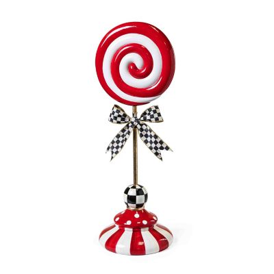 Deck the tabletops with this large peppermint lollipop topiary decorated with red swirls and standing on a base of stripes and dots. It’s trimmed with a Courtly Check® ribbon bow.