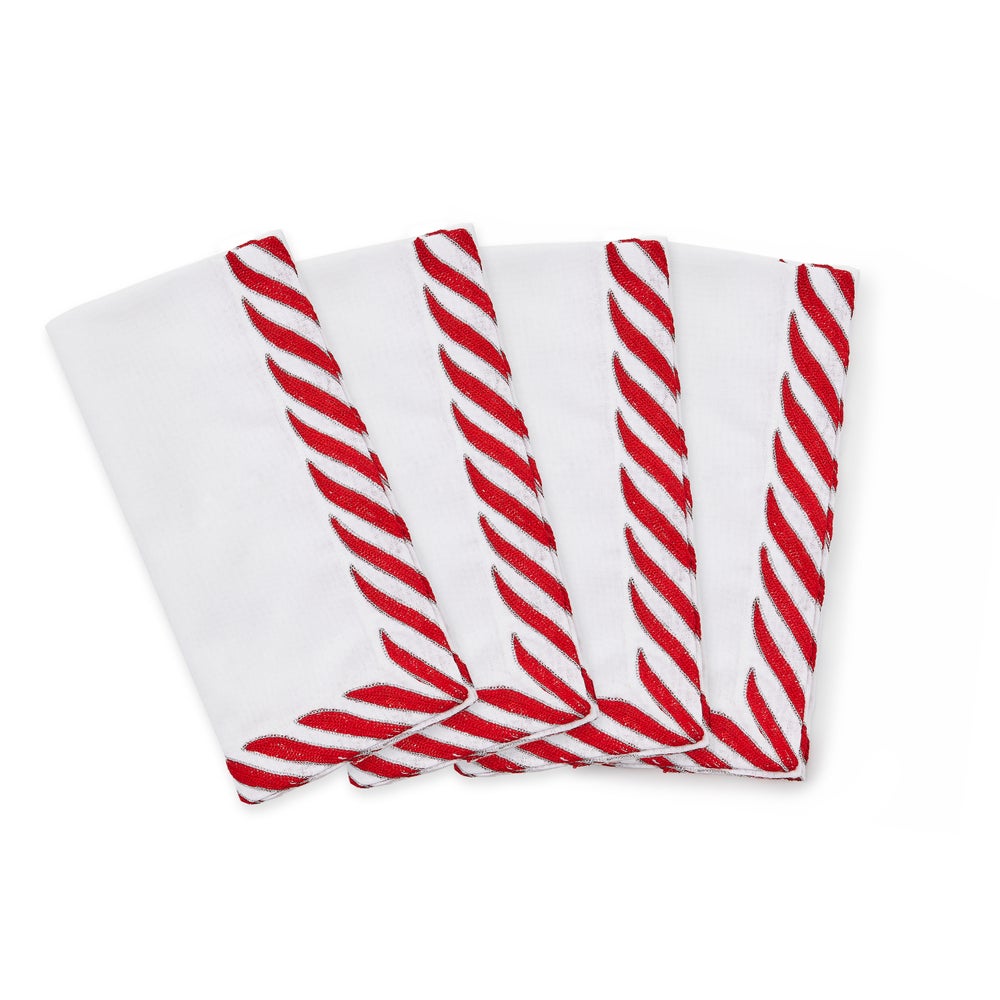 Deck your holiday tabletops with this set of four white napkins, edged with striped red borders done in chainstitches.