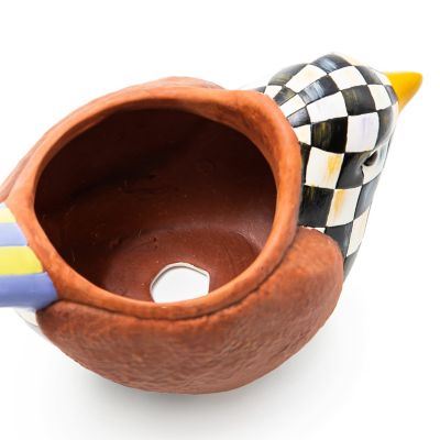 The terra cotta Persephone Bird Planter, accented with hand-painted Courtly Check, is inspired by our feathered friends. Holds a 4-inch pot.