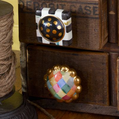 While quite handsome from any distance, the intricate splendor of our Courtly Check® Petit Four Square Knob emerges upon closer inspection. Hand-painted onto a petite ceramic square, our signature color-dragged checks have a dash of rich jewel tones woven into each brushstroke. Gold lustre dots add a little shine right up front and center. With fresh yet timeless palettes painted onto silhouettes of bold angles and graceful curves, our Petit Four Square Knobs mix and match wonderfully with each other and other knob patterns to brighten any space with a style all your own.