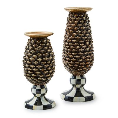 Autumn will be all aglow with this short pillar candle holder, accented with a pinecone-shaped body on a hand-painted Courtly Check® base. It holds a pillar candle with a 3″ diameter.