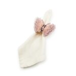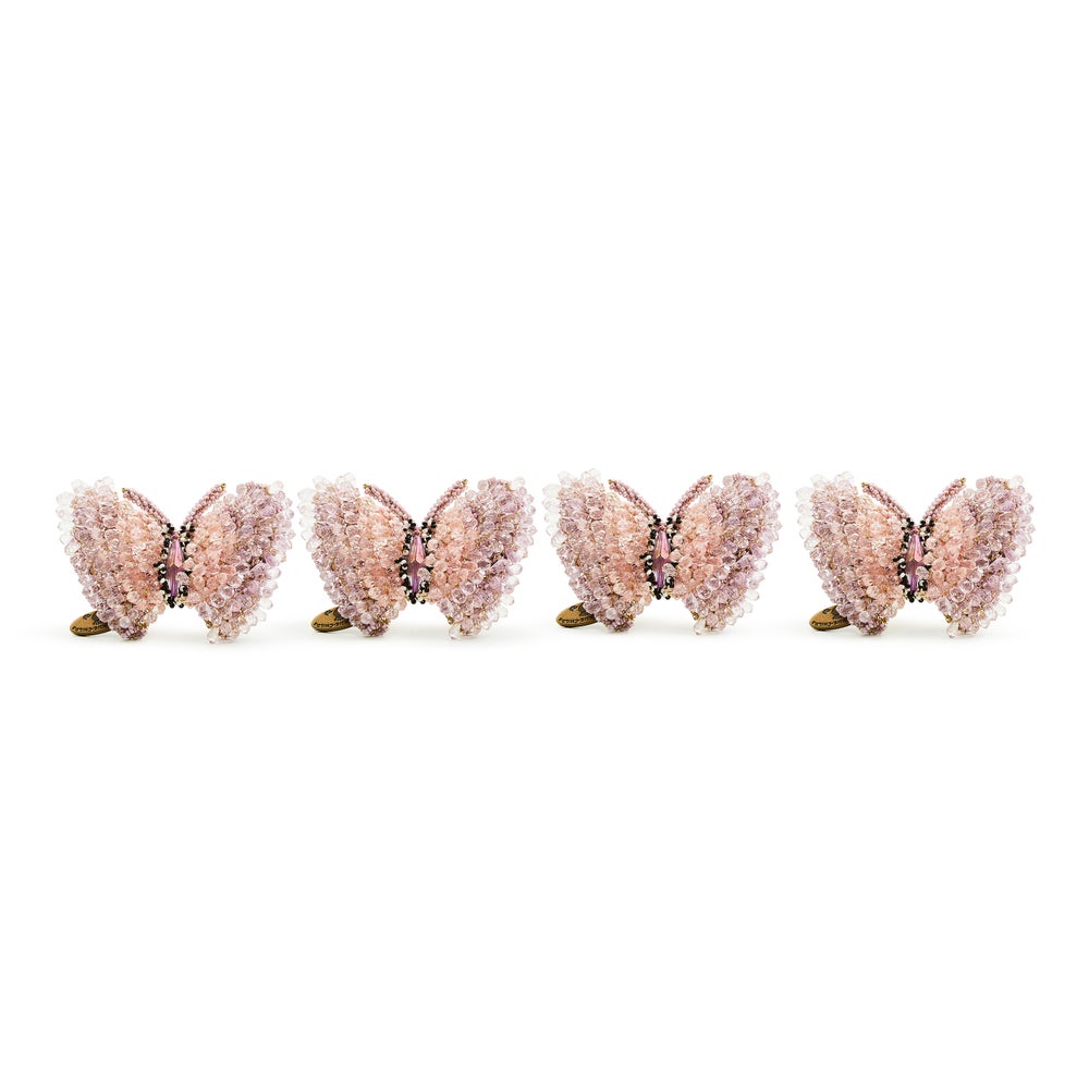 Inspired by the delicate strength of the butterfly, bring serene style to your table with our our set of four pink butterfly napkin rings. Each ring features beads and sequins on a frame of iron and brass with a band of pink and cream beads. Pair with our Rosy Check plating or other iconic dinnerware and Everyday place settings for the perfect tabletop collection.