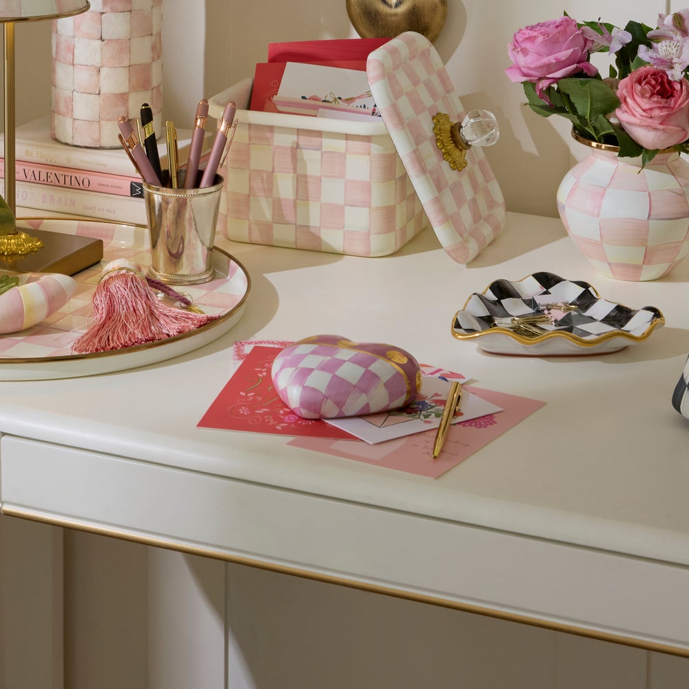 Have a heart for our Pink Dotty Heart Ceramic Decor, made start to finish in Aurora, NY. Featuring pink checks on the bottom and gold lustre dots on top, it’s a piece of decor that can be used as a paperweight. Turn it over and you’ll see the marks of the artisans who made it.