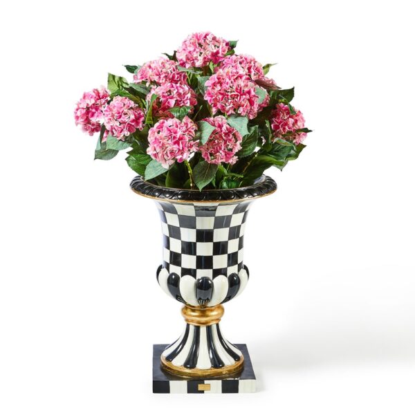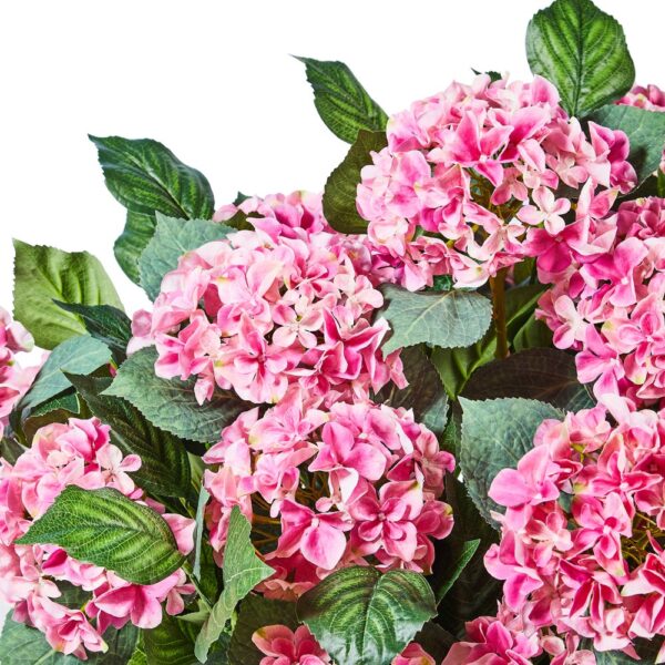 This all-weather everlasting pink hydrangea is always full and fresh. Presented in a black pot, it drops into our urns and can be displayed on a tabletop, too.
