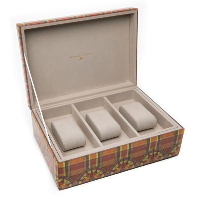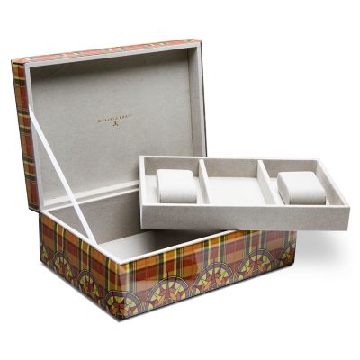 Store your treasures in a special spot that’s fitting of their value. The Plaiditudes Men’s Jewelry Box presents our world view (Courtly Check®, of course!) digitally printed on glass, finished with beveled edges. Inside, it’s lined in soft grey cotton velvet with a removable tray for three watches.