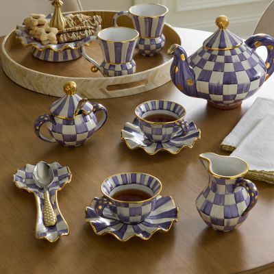 The Plum Check Ceramic Teacup is dainty only in appearance. Handmade and hand-painted in a range of plum hues, it’s trimmed with gold lustre and stamped by the Aurora artisans involved in its creation. Pair it with the companion Plum Check Ceramic Saucer for the perfect cup of tea.