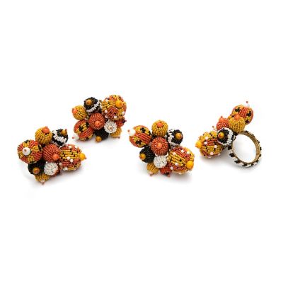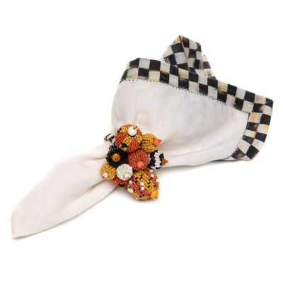 Add the jeweled touch of MacKenzie-Childs to your harvest table with our set of four Polka Pumpkin Napkin Rings. Featuring a medley of orange, black, and white glass beads on a frame of iron and brass, there’s a band of black and white beads that wraps around the napkin.