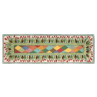 The 2’6″ x 8′ Poplar Ridge Runner features one of our classic Taylor ceramic patterns, bringing its color and charm to your floors. This wool-blend, hand-tufted rug is a mishmash of florals, diamonds, and stripes, and the pattern pays tribute to Poplar Ridge, a local spot that has spectacular views of Cayuga Lake from the hilltop just above Aurora. More interest comes from the weaving technique, where the blossoms are sculpted slightly higher, adding a bit of dimension.