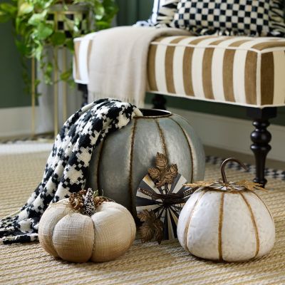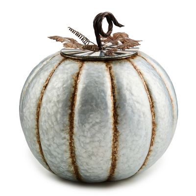 Bring a bit of MC into the outdoors with this large galvanized metal pumpkin. The top, embellished with metal leaves and Courtly Stripe, lifts to hold a potted plant or provide storage. Use in a protected location and store inside during winter.