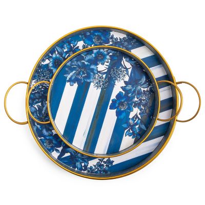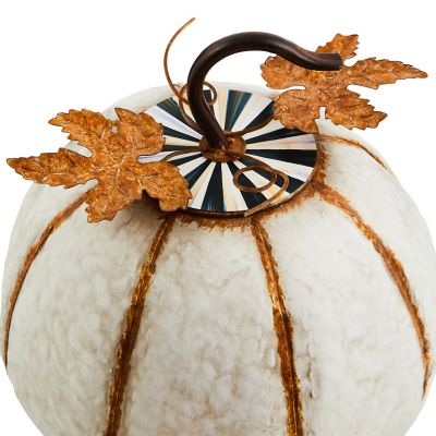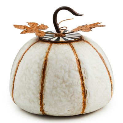 Bring a bit of MC into the outdoors with this small galvanized metal pumpkin. The top, embellished with metal leaves and Courtly Stripe, lifts to hold a potted plant or provide storage. Use in a protected location and store inside during winter.