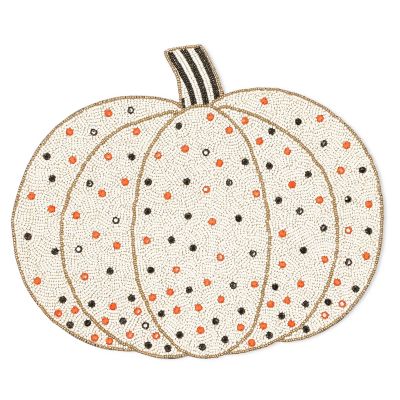 This placemat lends sparkle to the harvest table, featuring a large pumpkin that’s entirely beaded with orange and black polka dot accents.