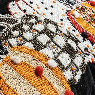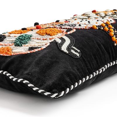 Add some pumpkin spice with this lumbar pillow, featuring a plethora of pumpkins, accented with a dimensional beading on a background of black cotton velvet. It’s trimmed with black and white twisted cording.
