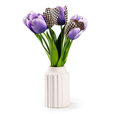 These everlasting purple tulips are always in full bloom, accented with petals of Courtly Check® and set in a ceramic, ivory vase.