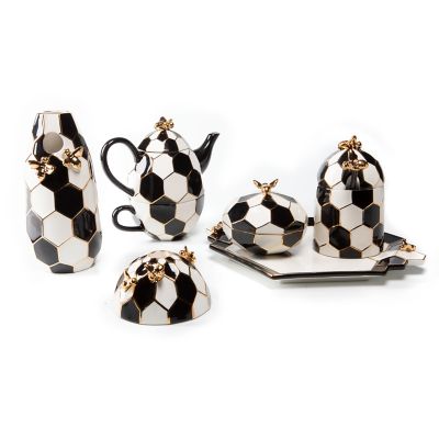 The ceramic Queen Bee Trinket Dish stores with style. Decorated in a modern black and white hive pattern, trimmed with gold lustre, it’s embellished with a buzz-worthy bee on its lid.