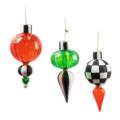 Make the tree merry and bright with this set of three glass drop ornaments, mixing translucent red and green glass with glittered black and white patterns.