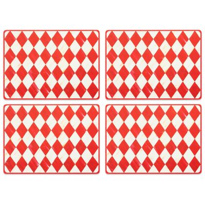Top your table and keep surfaces clean and protected with this set of four red harlequin cork back placemats. The heat-resistant lacquered surface features an art print on a hardboard substrate that is backed with natural cork.