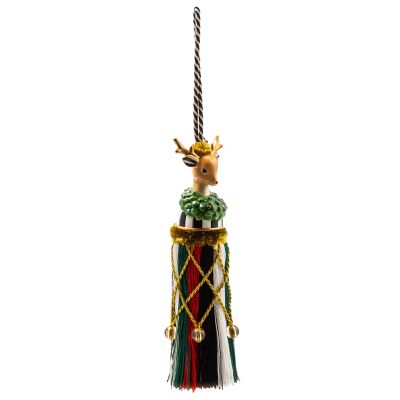 This tassel features a hand-painted ceramic deer, trimmed with a skirt of fringe that’s embellished with gold cording and beads. A loop of twisted black and white cording makes it easy to hang it from the dining room chandelier or as an ornament on the Christmas tree.
