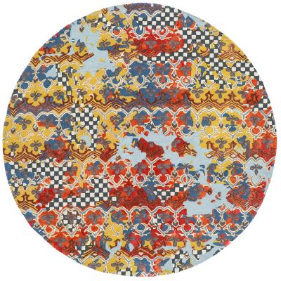 This wool-blend 6’ round rug mixes watercolor hues, black and white checks, and mosaic shapes. The checks are looped and sheared for added dimension.