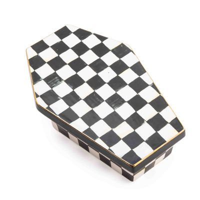 Watch candy disappear faster than you can say, “hocus pocus,” when it’s displayed in this two-piece ceramic coffin-shaped dish, decorated with checks and featuring a jolly skeleton inside.
