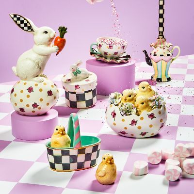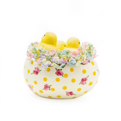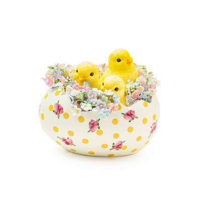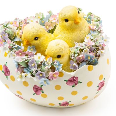 Our Rose Garden Peekaboo Egg simply says springtime. Three chicks peek out of a cracked egg, decorated with florals and polka dots, accented with paper flowers.