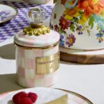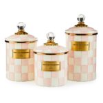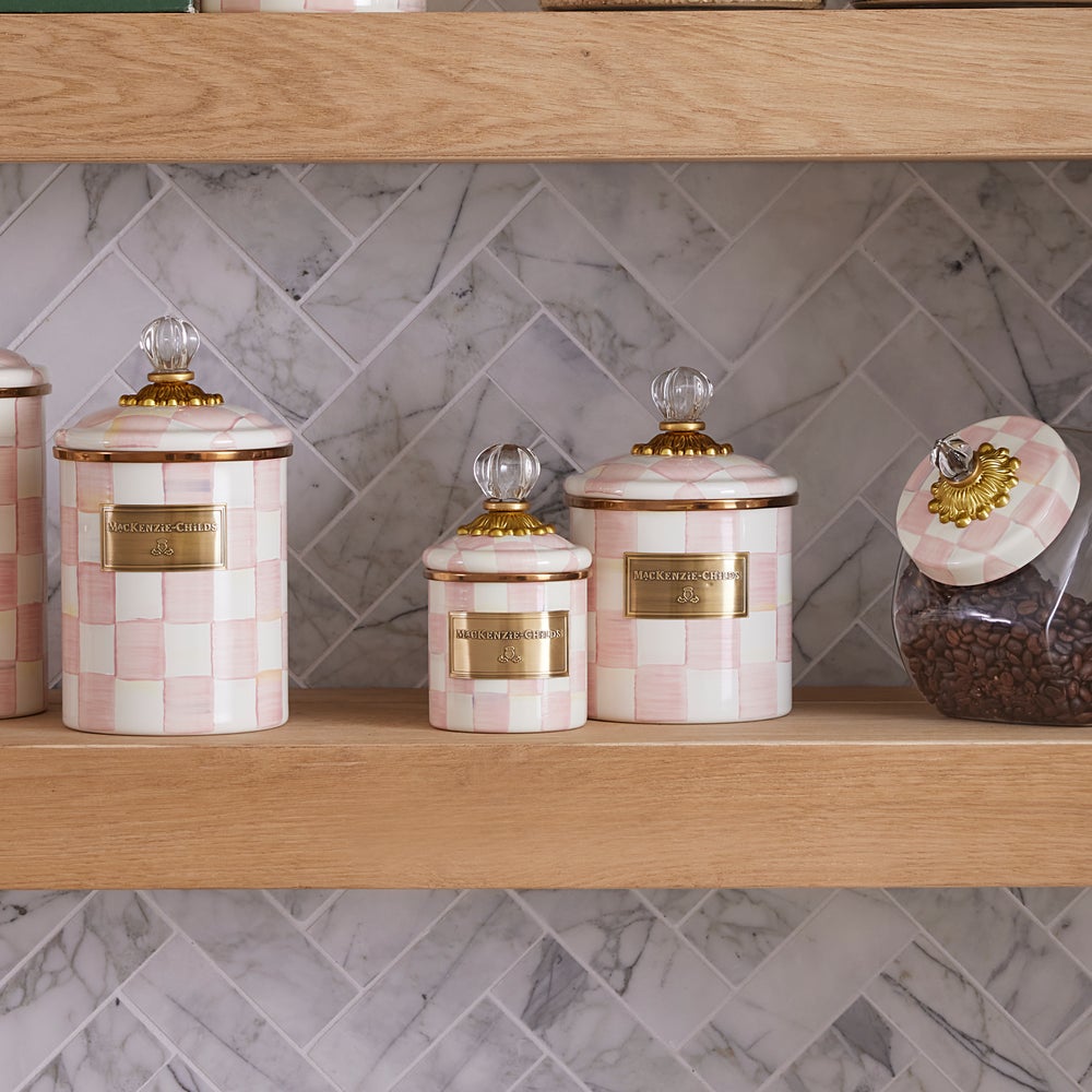 Pantry staples, flour, sugar, and coffee might seem the most obvious of contents with which to fill Rosy Check Enamel Canisters, but the possibilities are endless! Keep them in the kitchen with coffee beans and tea bags, cookies and candies, or dog biscuits and birdseed, or invent new uses around the house. Each enameled steel canister is hand-painted with color-dragged checks in a range of rosy hues and topped with an elegant clear glass knob. These canisters stand beautifully alone or harmonize delightfully in a set.