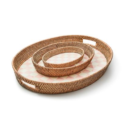 The Rosy Check® Enamel & Rattan Party Tray is an ample tray for breakfast in bed, a garden party or your personal carry-out. As practical as it is pretty, this entertaining tray with handles mixes woven natural rattan against our hand-painted Rosy Check.