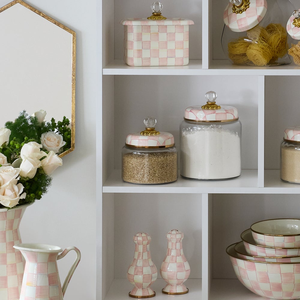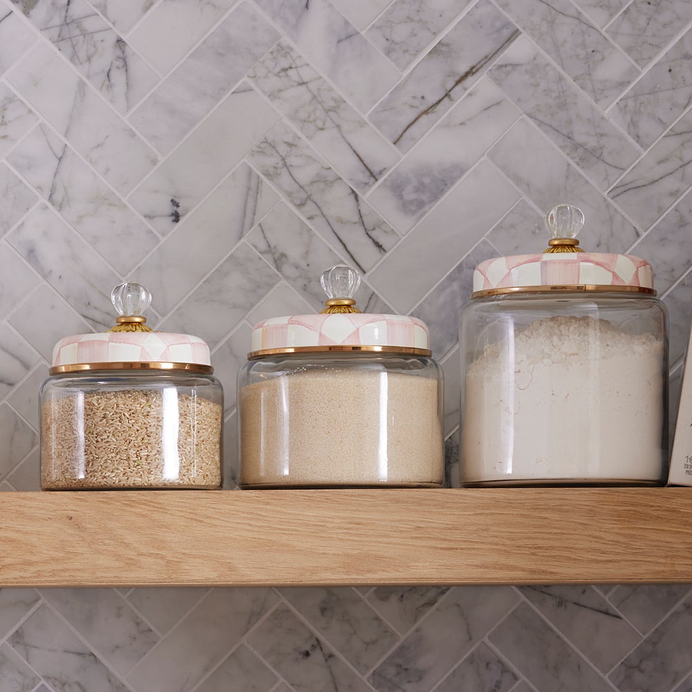 Keep countertops tidy in MacKenzie-Childs style with Rosy Check Kitchen Canisters. With color-dragged rosy checks on the hand-painted enamel lid, who could blame you for wanting to overhaul the whole pantry? Collect all three convenient sizes for countless contents. These canisters stand beautifully alone or harmonize delightfully in a set.