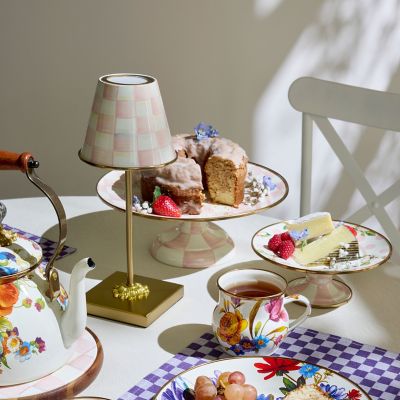 The Rosy Check® LED Rechargeable Cafe Table Lamp is the little light that shines big without the inconvenience of cords. Featuring our pink check pattern on a brass-finish base, it illuminates for up to three hours and recharges with a 5-watt USB cable (included). It operates with ease by tapping the shade on the top, and there are three settings for brightness.