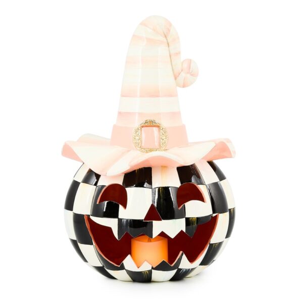 Add a bewitching touch of elegance to Halloween with the Rosy Happy Jack Illuminated Pumpkin. Decorated in black and white checks and wearing a pink witch’s hat and a cheerful carved expression, this glowing pumpkin is a delightful piece for spooky season.