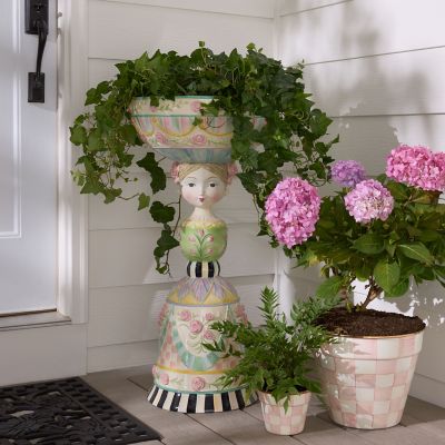 Elevate the presentation of our stacked seasonal accents with this weather-resistant trophy planter. Crafted of durable fiberglass and resin, the stacked shape features a pretty lady that’s embellished with florals, swirls, and Rosy Check® and Courtly Check®. There is a drainage hole in the bottom, so you can add your own plants.