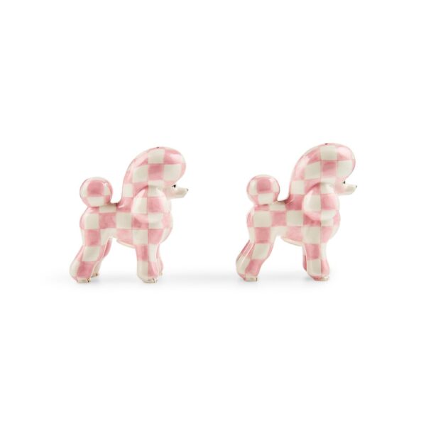 Charm every dinner guest with this ceramic Rosy Poodle Salt & Pepper Set. Decorated with pink and white checks.