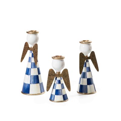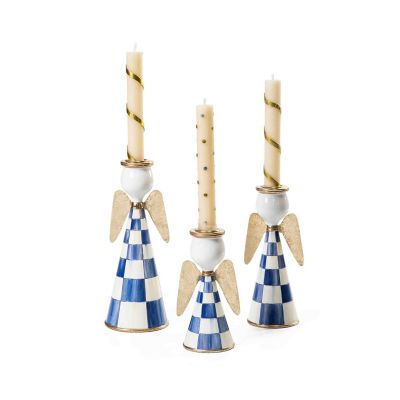 Illuminate the holidays with this set of three Royal Check ® Angel Candle Holders, simply decorated with Royal Check and gold lustre. Of varying heights, each holds a dinner candle.