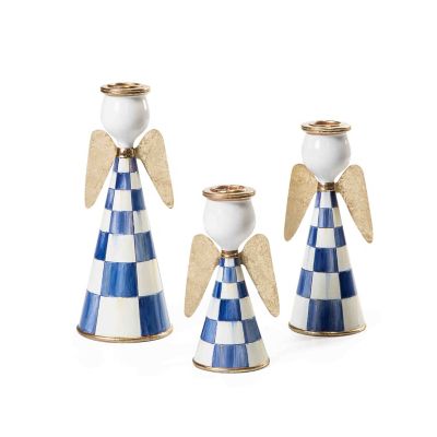Illuminate the holidays with this set of three Royal Check ® Angel Candle Holders, simply decorated with Royal Check and gold lustre. Of varying heights, each holds a dinner candle.