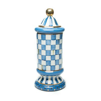 Put your good taste on display with our ceramic Royal Check Column Canister. Featuring hand-painted stripes, dots, and checks, and trimmed with gold lustre by our master artisans in Aurora, New York, it stores just about anything—from pantry staples to office supplies—with style. Pair it with the complementary Royal Check Globe Canister and the Royal Check Groovy Canister to make an interesting set of shapes.