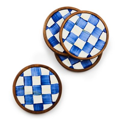 Add a pretty and practical accent to the table with blue and white Royal Check Coasters. This set of four hand-painted enamel coasters protects your table tops and features our checked pattern in a range of blue hues with an acacia wood base.