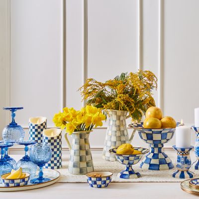 Every celebration can glow with MacKenzie-Childs style with our Royal Check Flicker 10″ Pillar Candle. This everlasting light, decorated with our Royal Check pattern, has the look of a wax candle but glows with flickering light created with two AA batteries. The light can be set on a five-hour timer with an included remote control.