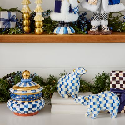 Put your good taste on display with our ceramic Royal Check Groovy Canister. Featuring hand-painted stripes, dots, and checks, and trimmed with gold lustre by our master artisans in Aurora, New York, it stores just about anything—from pantry staples to office supplies—with style. Pair it with the Royal Check Globe Canister and the Royal Check Column Canister to make an interesting set of shapes.