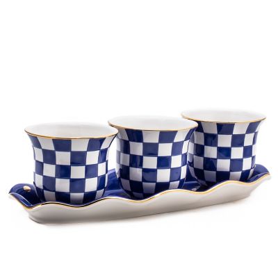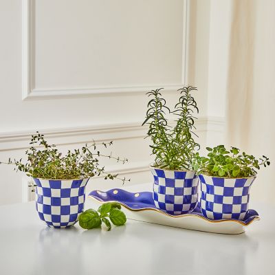 The hand-painted ceramic Royal Check Herb Garden Set includes three checked flower pots displayed on a tray trimmed with dots and gold lustre. Perfect for growing parsley, sage, and rosemary on your kitchen windowsill.
