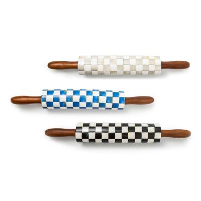 Add MacKenzie-Childs style to a kitchen staple with the Royal Check® Rolling Pin. It features blue checks hand-applied to a ceramic center, set off with wood handles.