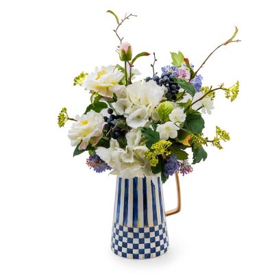 Our Royal Fresh Cut Arrangement is blue-tiful, with everlasting white silk anemones, accented with dogwood blossoms, bunches of blue berries, and leaves of Royal Check, presented in a ceramic pitcher decorated with our signature blue patterns.