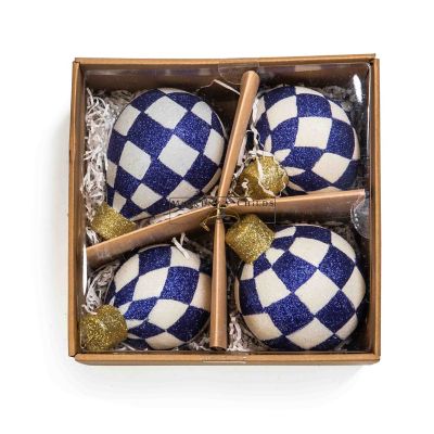 Make the tree merry and bright with this set of four glittered blue check glass ornaments. Each is a different shape and topped with a gold glitter cap.
