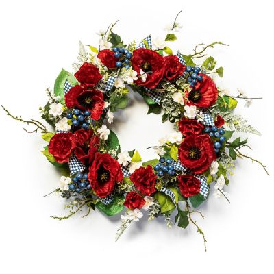Make a bold welcoming statement with this wreath, featuring everlasting red poppies and white dogwood flowers, plus Royal Check® leaves and clusters of blue berries. It’s a perfect way to add a patriotic pop to summer.