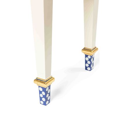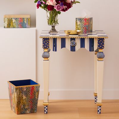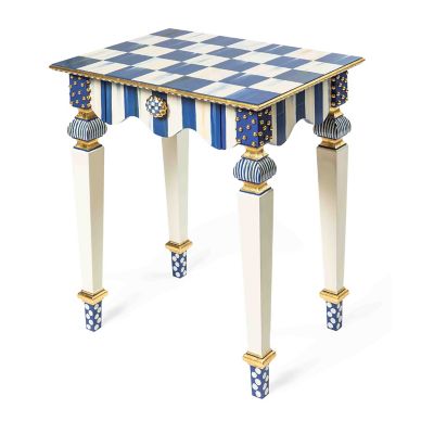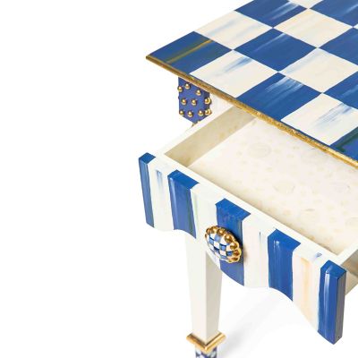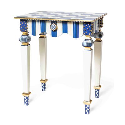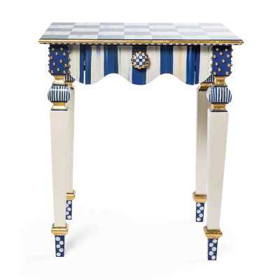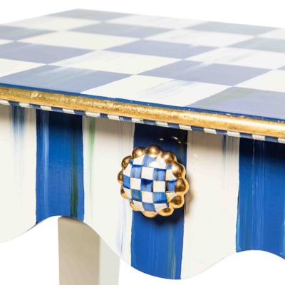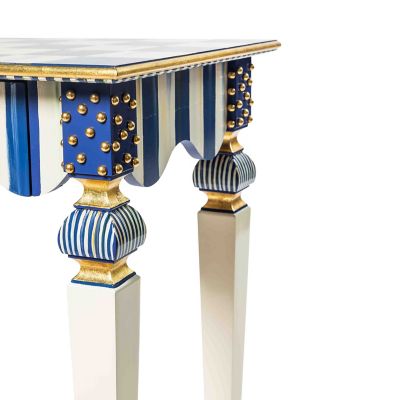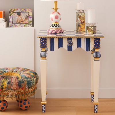 Our signature Courtly Stripe Console Table has been reimagined as the smaller, but no less stylish, Royal Stripe Side Table. Handcrafted in Aurora, New York, it features a graceful, scalloped apron, corner blocks with gold studs, and carved legs that are decorated with stripes, checks, and dots. The drawer opens with Royal Check® ceramic knobs.