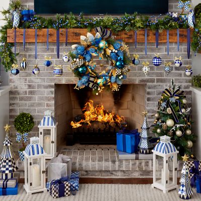 Deck the tabletops with the Royal Tabletop Tree. Made of everlasting greenery, it’s accented with golden pinecones, blue leaves, shatterproof ornaments, and finished with Royal Velvet Ribbon. It’s set in a ceramic Royal Check pot that can be inserted into the Royal Check Pedestal Tabletop Urn.