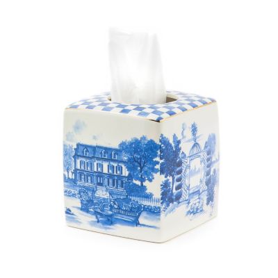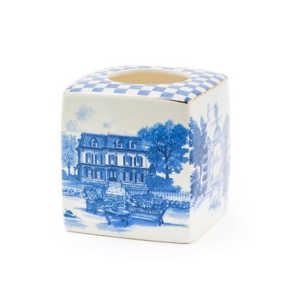 Make every sneeze and sniffle stylish with the Royal Toile Tissue Box Holder. This ceramic cover, decorated with landmarks from our Aurora campus with Royal Check on top, fits a standard boutique box of tissues.